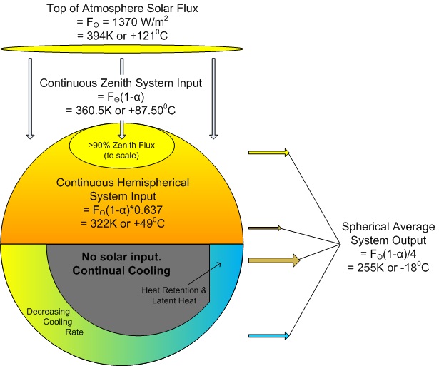 [Reply: In that case, the same radius, but plane vs. hemisphere, the input temperature and flux density will not be the same. This is actually already described in my model where it shows the “disk” plane of sunshine input, then getting distributed over a hemisphere of the same radius, then exiting over a whole sphere.]