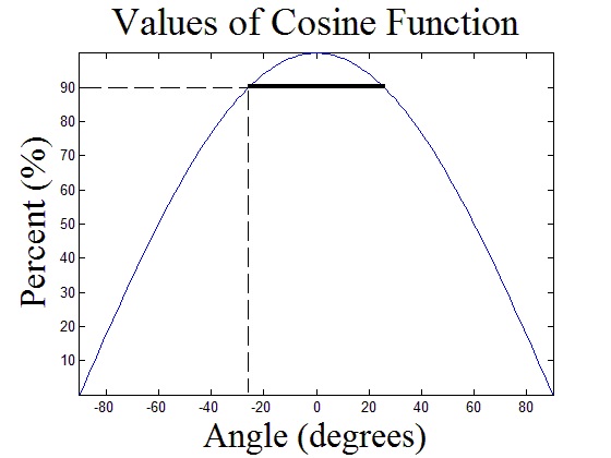 In the reality-based heat flow model presented in previous posts, we see that the power of sunshine is ninety-percent as strong as +88oC for a very wide swath of the planetary diameter. The actual function which describes the power of sunshine, going from directly underneath to the Sun (which we call the “solar zenith”), to the side where the Sun’s rays just glance the edge of the Earth, is called the “cosine”. It has a value of 100% when at the zenith, and 0% when at an angle of 90 degrees, as you can see here: