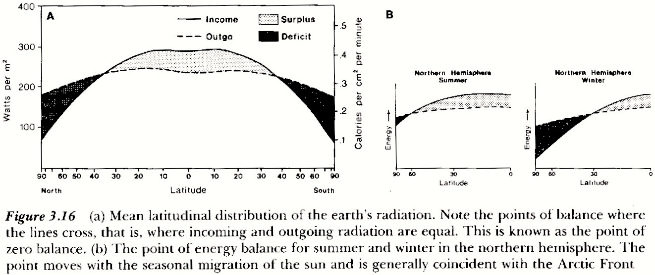 It is very important for a real scientist to understand how sunshine gets distributed upon the planet, because geologists and meteorologists have observed something which they call the point of zero energy balance (ZEB). This “point” is the latitude, i.e., the angle away from the equator, at which the local amount of incoming solar energy is equal to the local amount of outgoing energy from planet Earth. This is shown the next diagram: