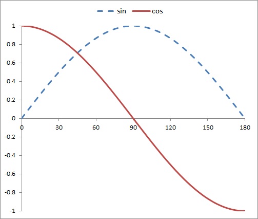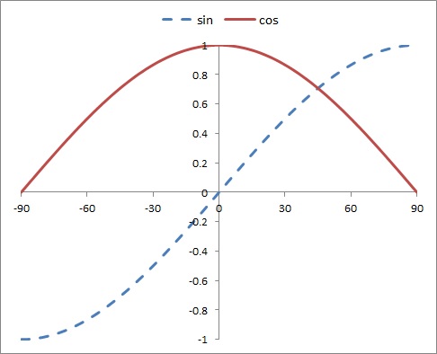 and then the cosine and and sine terms represent motion in their particular dimension. With this argument, the cosine and sine terms over a range of real-space velocity -c ≤ v ≤ c, is a range from 0 to 180 degrees, which for cosine and sine looks like this: