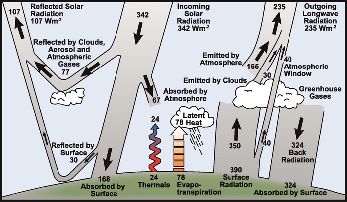 Of that 342 W m−2 of incoming solar radiation, 107 is refelected back into space without heating the surface, leaving that 235 absorbed by the earth/atmosphere system. That is balanced by the 235 outgoing longwave (infra red) radiation. So the system is at thermal equilibrium, neither heating up nor cooling down. (Actually as explained in the paper and elsewhere, more accurate numbers put the outgoing IR radiation at slightly less than the incoming. This can be attributed to the increasing CO2 concentration trapping more outgoing IR radiation, causing the planet to warm.)