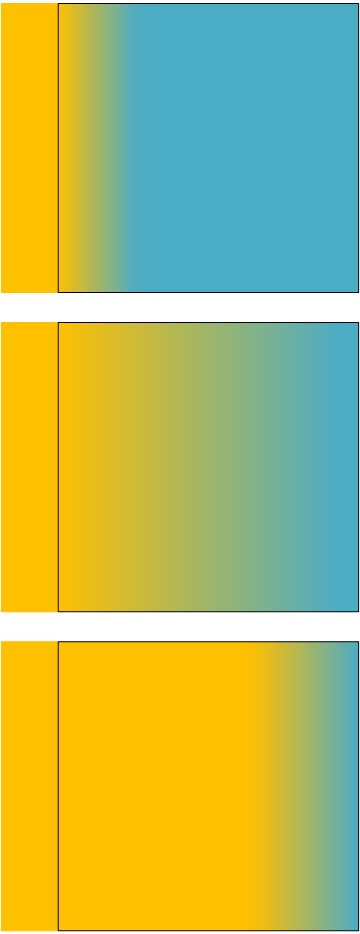 Top: A passive cold object (blue, square) is brought near a heat source (rectangle, yellow). Middle: As the passive cold object is warmed by the heat source, it presents back-resistance to heat flow from the source of heat. Bottom: This requires the source of heat to heat up some more so that it can continue sending heat energy to the passive object.