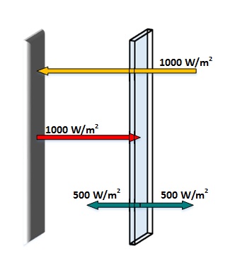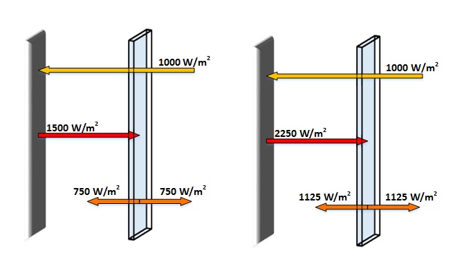 The radiative greenhouse effect begins with the following problem depicted in the image below: Shortwave radiation passes through a substance (in this case, a pane of glass) of which it is transparent, and is then absorbed by another surface further on. The shortwave-absorbing surface (shortwave surface henceforth) is insulated on its backside. The shortwave surface then thermally radiates the input energy back out in one direction only, but at longwave frequencies to which the other substance or layer is now opaque. Thus, the other layer absorbs the longwave radiation from the shortwave-absorbing surface. At this point, the longwave layer emits it own thermal radiation, but it must emit in two directions because it is not insulated on either side. The longwave layer thus emits back towards the shortwave surface and also back to outer space, and so to conserve energy it only emits half of the energy it absorbs to either of those directions. At this point, total energy is not conserved to the outside of the system because only half of the input energy is making it back out to outer space. So, how do we proceed?