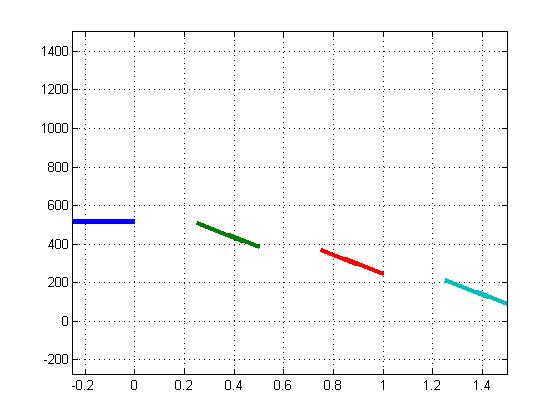 Figure 4: A 3-layer de Saussure device at equilibrium with 1000 W/m2 input, with non-backradiation-heating boundary conditions. The plot is Temperature vs. position. The left-most line is the innermost absorbing layer’s temperature, and the other lines are 3 layers temperatures.