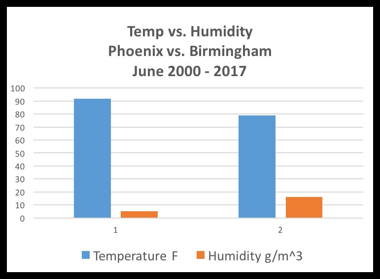 In this graph the blue bars are the average June temperatures over the past 18 years in °F for Phoenix (left) and Birmingham (right.) The orange bars are the average June absolute humidity readings over the past 18 years in g/m3 for Phoenix (left) and Birmingham (right.)