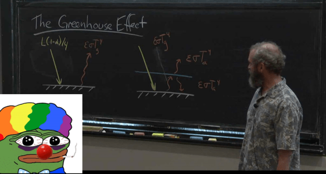 You know who the clown is? That clown is a PhD in Geophysics at the University of Chicago! To be a PhD in geophysics requires that you’ve taken advanced-level multi-dimensional calculus including partial differential equations and Fourier Tranforms, have entirely completed classical physics, some computer science courses, courses in statistics, and much more. But look at the clown look at their clown flat Earth greenhouse effect of clown climate alarm so proudly!
