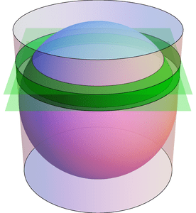 -For any two parallel planes with distance h between them which cut off a band on a sphere, the surface area of the band on the sphere is the same as the surface area of a cylinder band of height h with identical radius of that of the sphere.