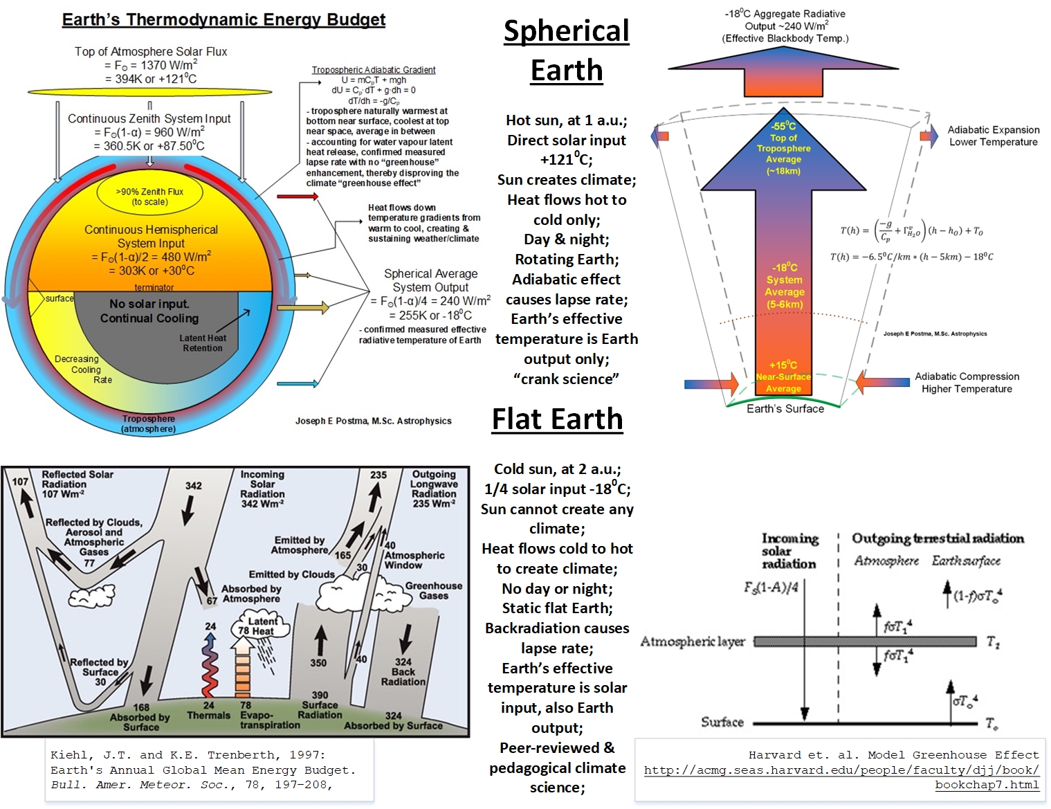 It is perhaps not surprising that the climatological radiative greenhouse effect does not actually exist, given that it is derived from flat Earth, where the Sun cannot create the climate or heat anything on Earth to higher than -18C, and where it is then derived to create the climate instead of the Sun. This climatological radiative greenhouse effect also implies heat recycling, and even heat flow from cold to hot in some descriptions, either of which are strictly physically impossible (heat cannot be recycled or reversed, and definitely cannot act from cold to hot).