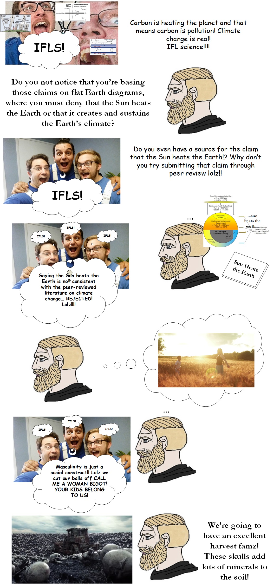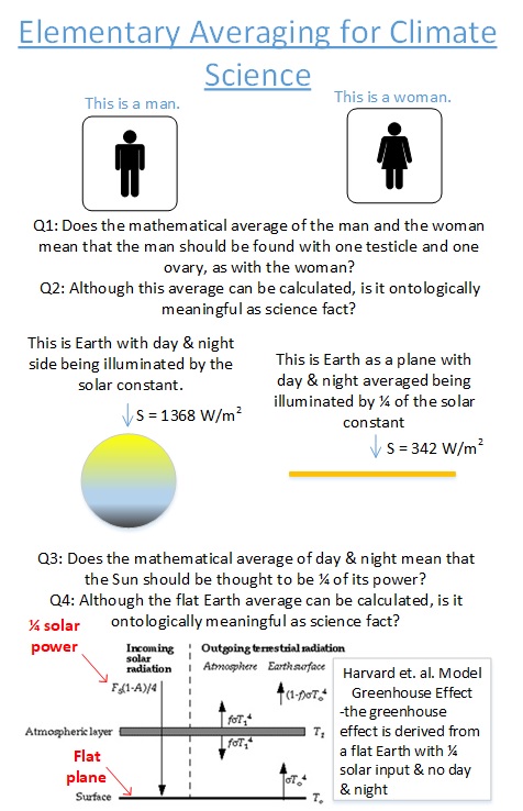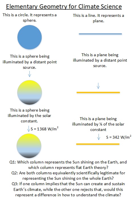 And so back to those introductory climate diagrams: What do they show? They show that the flux input from the Sun is equal to the flux output from the Earth. Given that input flux and output flux can only be numerically identical if the surface which receives the flux is equal in area to the surface which emits the flux, the Earth is then drawn as a flat line since this is the only geometric way that that equality could hold – if the Earth were a flat plane facing the Sun. In other words we’re literally doing mathematical flat Earth theory here. If one were to start with a flat Earth assumption from the beginning, one would necessarily draw the Earth as a flat plane and then work out the math for how that would have to work, and the math would be the same as is shown in the climate energy budget diagrams. What is the distinction if our mathematical model has to look like a flat plane for the Earth, vs. we actually intended to do flat Earth theory and get the same math and figures? It is difficult to split hairs here.