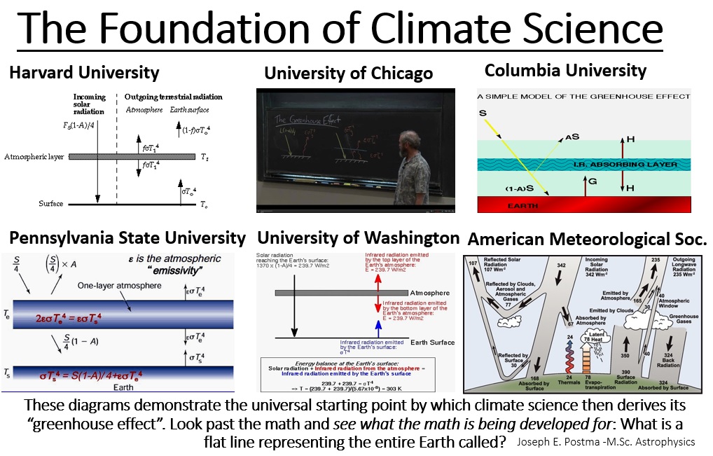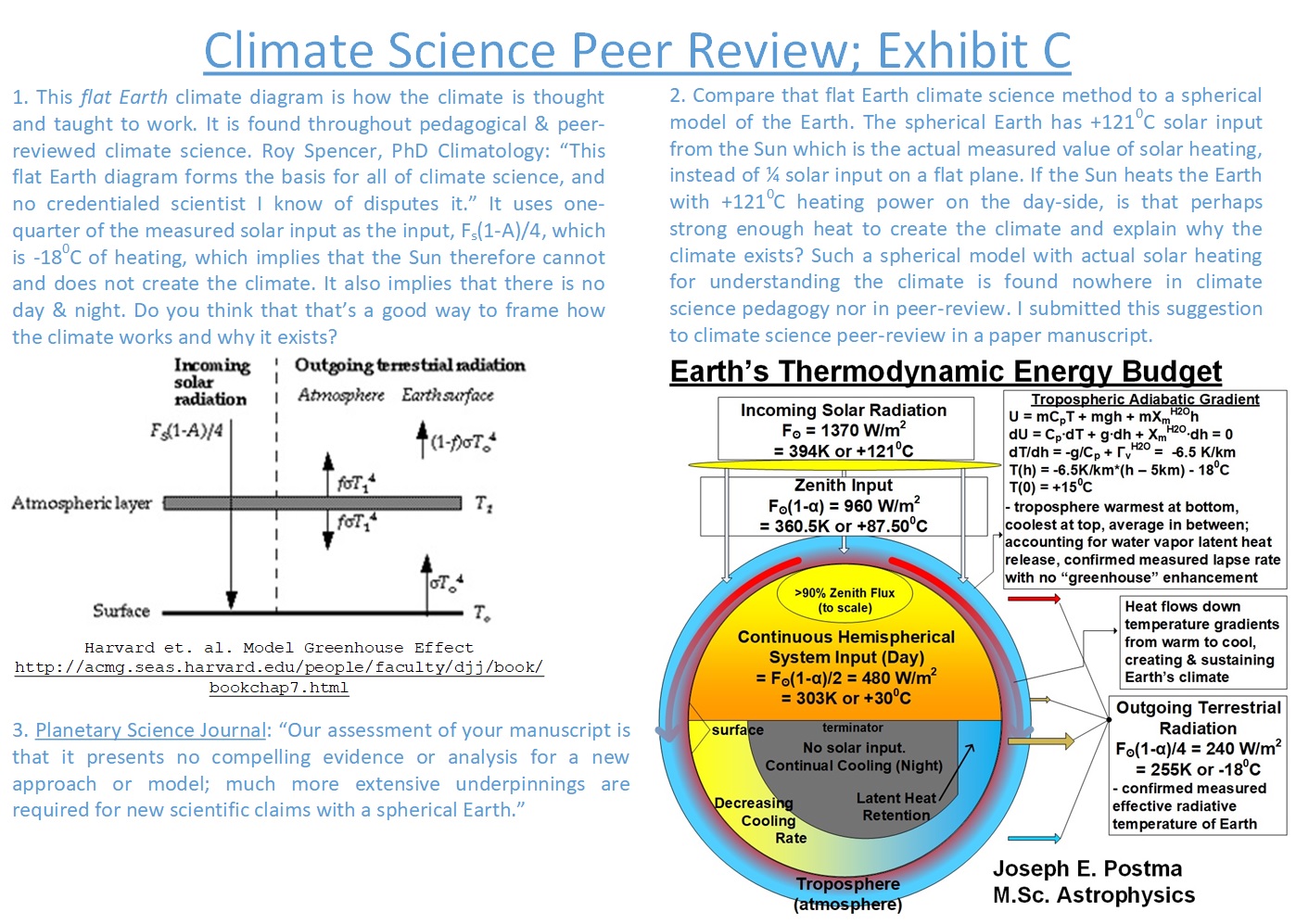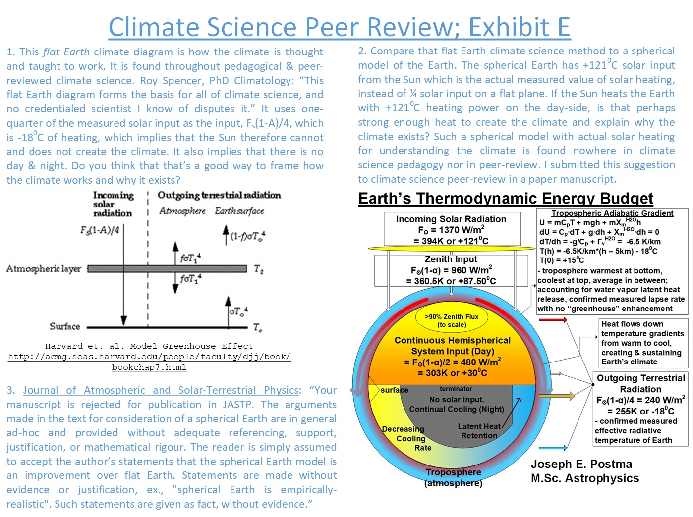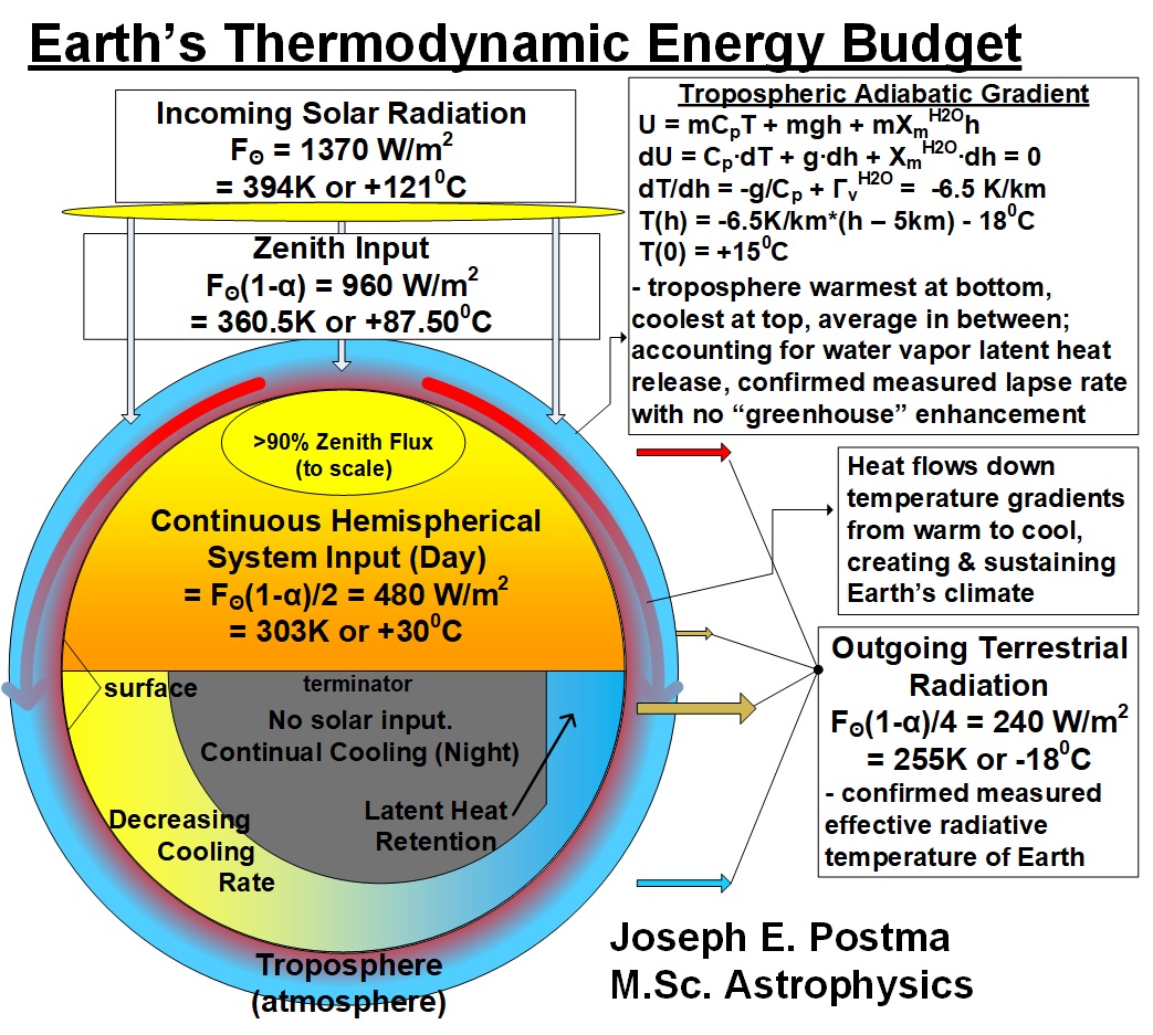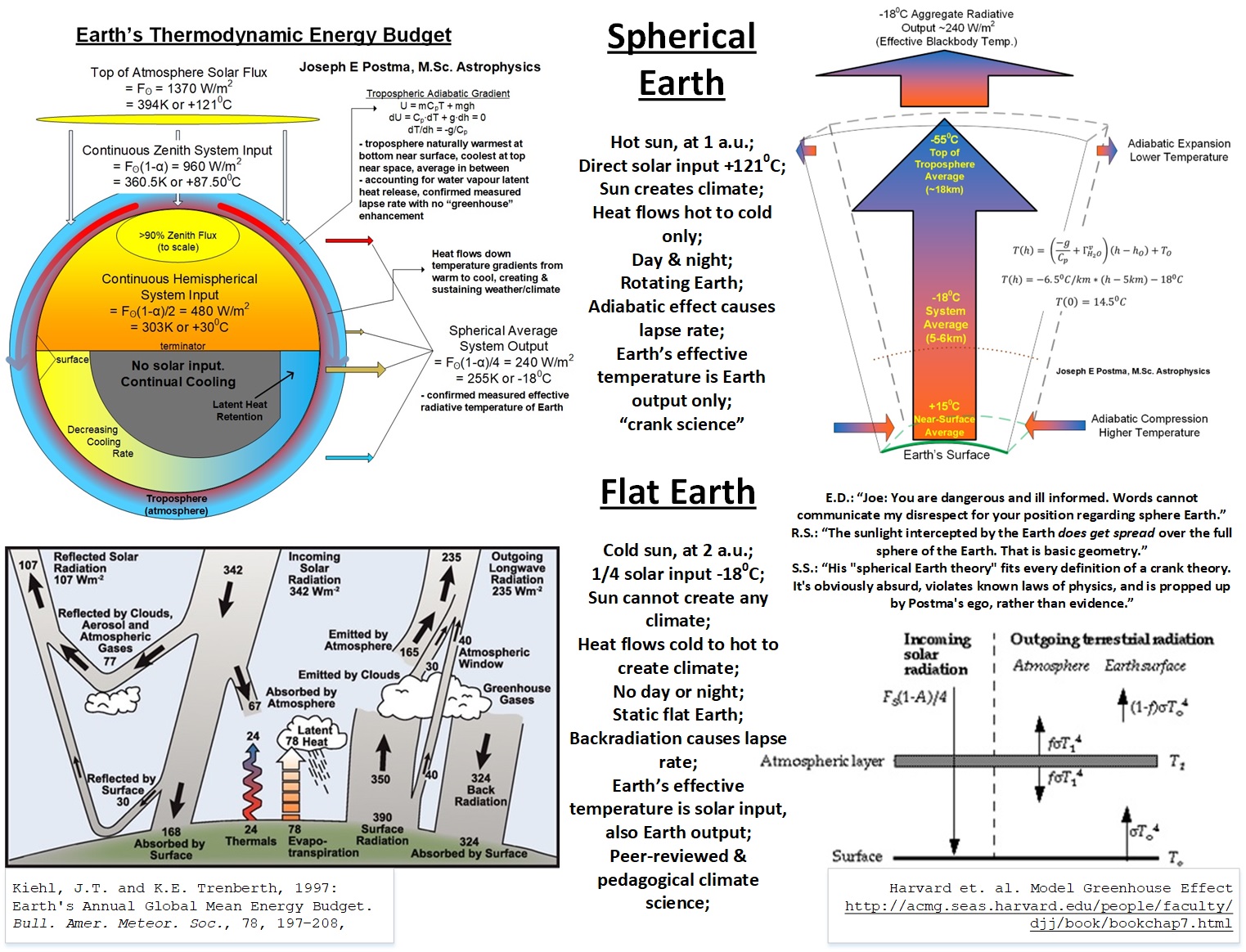 Thus, it is possible to do an energy budget with the Earth depicted as a sphere. This is truly a first in climate science, with the potential to transition the pedagogy away from flat Earth theory, although of course no scientists believe in flat Earth theory. There are tremendous benefits to teaching that the Earth is a sphere as opposed to a flat plane in an energy budget, as the mathematical physics results are so markedly different, and also incredibly informative. The spherical energy budget is able to demonstrate things about empirical reality about the climate which the flat Earth method simply cannot capture. Just as importantly, we can teach as a first principle the existence of the adiabatic effect and what it means about the temperature structure of the atmosphere, as opposed to simply leaving this fundamental feature of thermodynamics physics out of the discussion as the flat Earth method prefers. One incredibly pertinent conclusion is that the radiative greenhouse effect of flat Earth climate science seems to be a baseless postulate, whose claims to role in the climate are refuted by the adiabatic effect which of course was left out of the discussion. In other words, the radiative greenhouse effect was made up in order to fill the gap of flat Earth theory’s ignoring of the adiabatic effect. There is no radiative greenhouse effect.