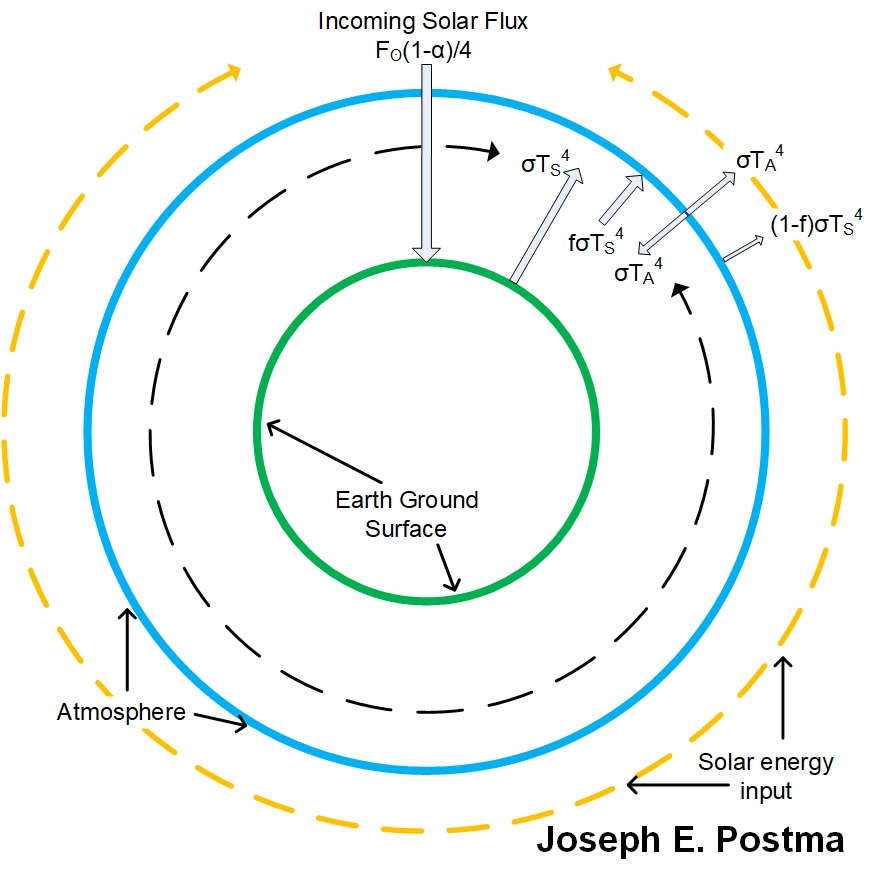 The most essential element of the pedagogical flat Earth diagram is its method of energy balancing which results in a concept known as the greenhouse effect. The figure is reproduced here for convenience.